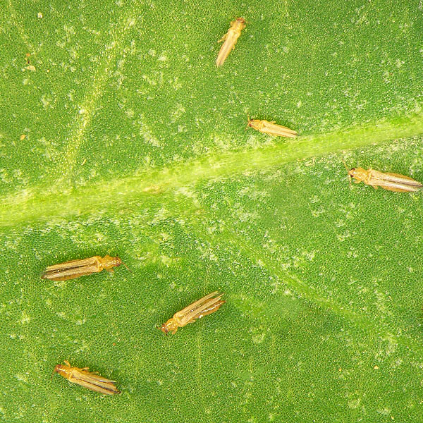 - Einige Arten ernähren sich nur von den äusseren Schichten des Blattes, der so genannten Epidermis, und dem darunterliegenden Mesophyll. Durch Anstechen der einzelnen Zellen können sie die Flüssigkeit aussaugen. Die betroffenen Zellen werden dann glänzend silbrig und hell. Der Schaden ähnelt damit dem von Spinnmilben. Einige Arten spritzen Pflanzengallen, in deren Innerem sie dann leben und sich ernähren. Einige Arten befallen nur spezifische Pflanzen, andere ein breites Spektrum unterschiedlicher Wirtspflanzen. Weitere Arten sind Blütenbesucher und ernähren sich daher von Pollen.